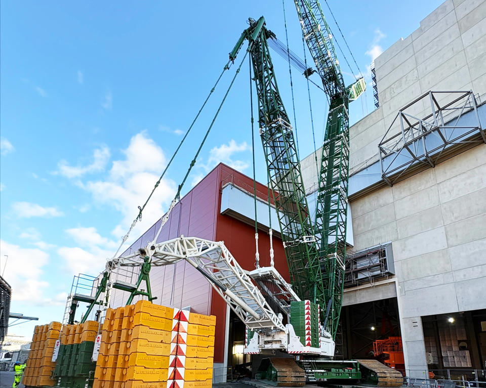 Hvad gør man, når en 216 ton tung gangbro skal løftes på plads under trange vilkår? Man tilkalder en muskuløs kæmpekran på larvefødder, der kan klare opgaven.