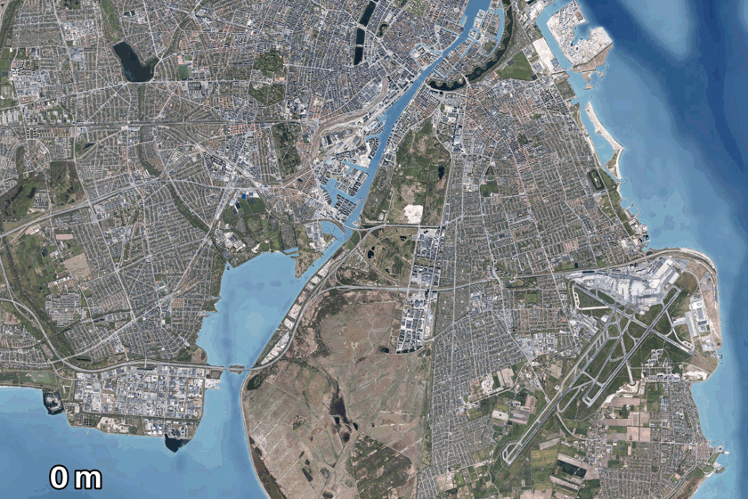Animation med eksempel på hvordan København kan blive oversvømmet ved en ekstrem stormflod fra syd i år 2075.